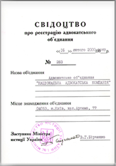 Адвокатське об’єднання «НАЦІОНАЛЬНА АДВОКАТСЬКА КОМПАНІЯ» зареєстровано Міністерством юстиції України у лютому 2000 року. Свідоцтво про державну реєстрацію № 283. Понад 16 років Компанія працює під гаслом «Компетентність & конфіденційність». Вагому частку в діяльності Адвокатського об'єднання «НАЦІОНАЛЬНА АДВОКАТСЬКА КОМПАНІЯ» складає юридичне забезпечення співробітництва у сфері бізнесу, правова підтримка підприємців, відстоювання ділової репутації, честі та гідності фізичних і юридичних осіб. Компанія посідає активну позицію та надає професійні послуги на високому рівні під час виборчих процесів. Формулою успішної діяльності «НАЦІОНАЛЬНОЇ АДВОКАТСЬКОЇ КОМПАНІЇ» - є поєднання ключових факторів, серед яких: кваліфікована команда з напрацьованим практичним досвідом, високі стандарти якості роботи та слідування моральним принципам, знання специфіки широкого кола юридичних питань та чітке розуміння потреб клієнтів. Саме тому, наша компанія виправдовує Ваші очікування від співпраці! Яскравим підтвердженням здобутків і зростання авторитетності Компанії стало нагороджєння, указом Президента України, Глави Адвокатського об'єднання почесним званням «Заслужений юрист України».